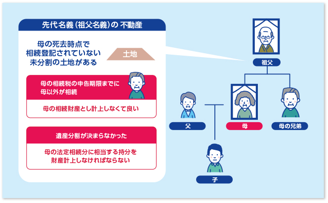 うーむ。先代名義の土地が未分割の場合、まずその土地を先代名義の相続人で分割するところから始まるんじゃ。この場合、スムーズに母の相続税の申告期限までに祖父の土地の遺産分割を祖父の相続人間で決まればいいんじゃが。。。